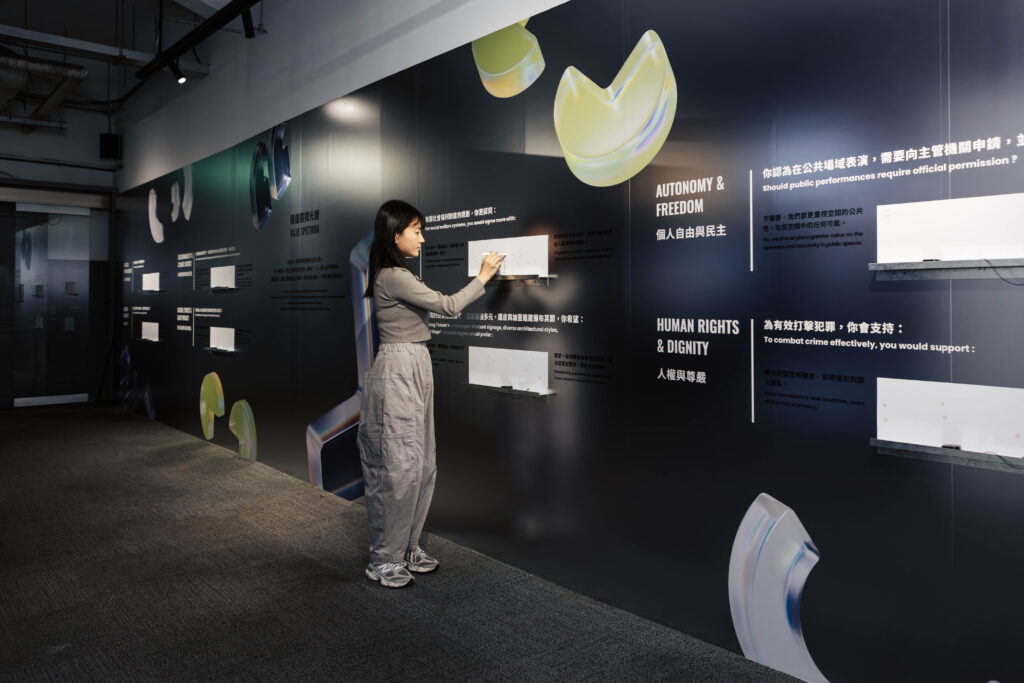 展示の最後では、7名の専門家から未来のトレンドとそのコアバリューが共有され、来場者はインタラクティブゲーム「価値選択のスペクトラム」に挑戦することで、民主主義を楽しみながら実践する。