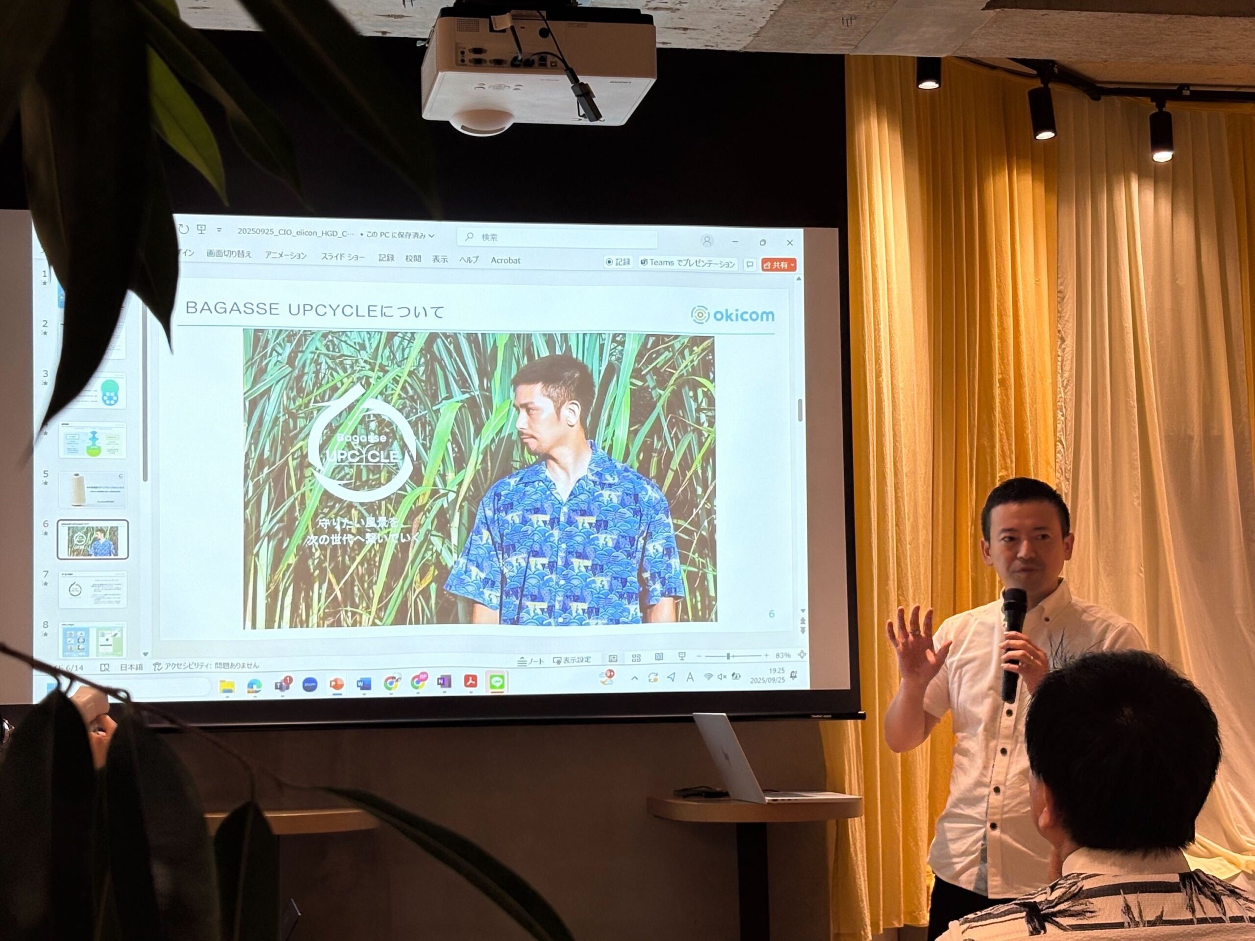 まずは未利用資源のアップサイクルを掲げ、さとうきびの未利用資源「バガス」をアップサイクルした紙、紙糸、生地など、高環境負荷素材に代わる新素材を開発するCurelabo株式会社の取締役・小渡晋治(おど・しんじ)氏に取組を共有いただきました。