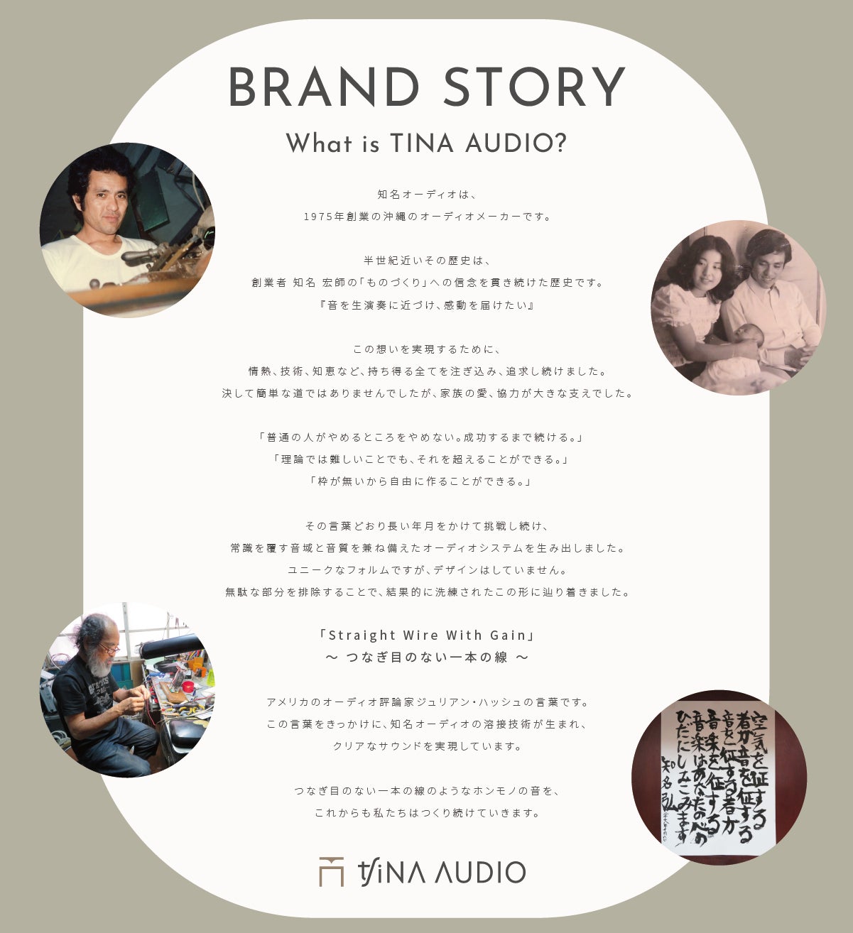 音への追及を続け、無駄のないシンプルで理にかなった知名オーディオの製品『TINA AUDIO(チナオーディオ)』は生まれました。『TINA AUDIO(チナオーディオ)』には、筒の中で生み出す本物の音を波紋のように外へと広げ、全てを優しく包み込む力があります。目には見えない空気の振動や空間の間(ま)、五感で感じる真善美の調和を新ブランドロゴで表現しています。