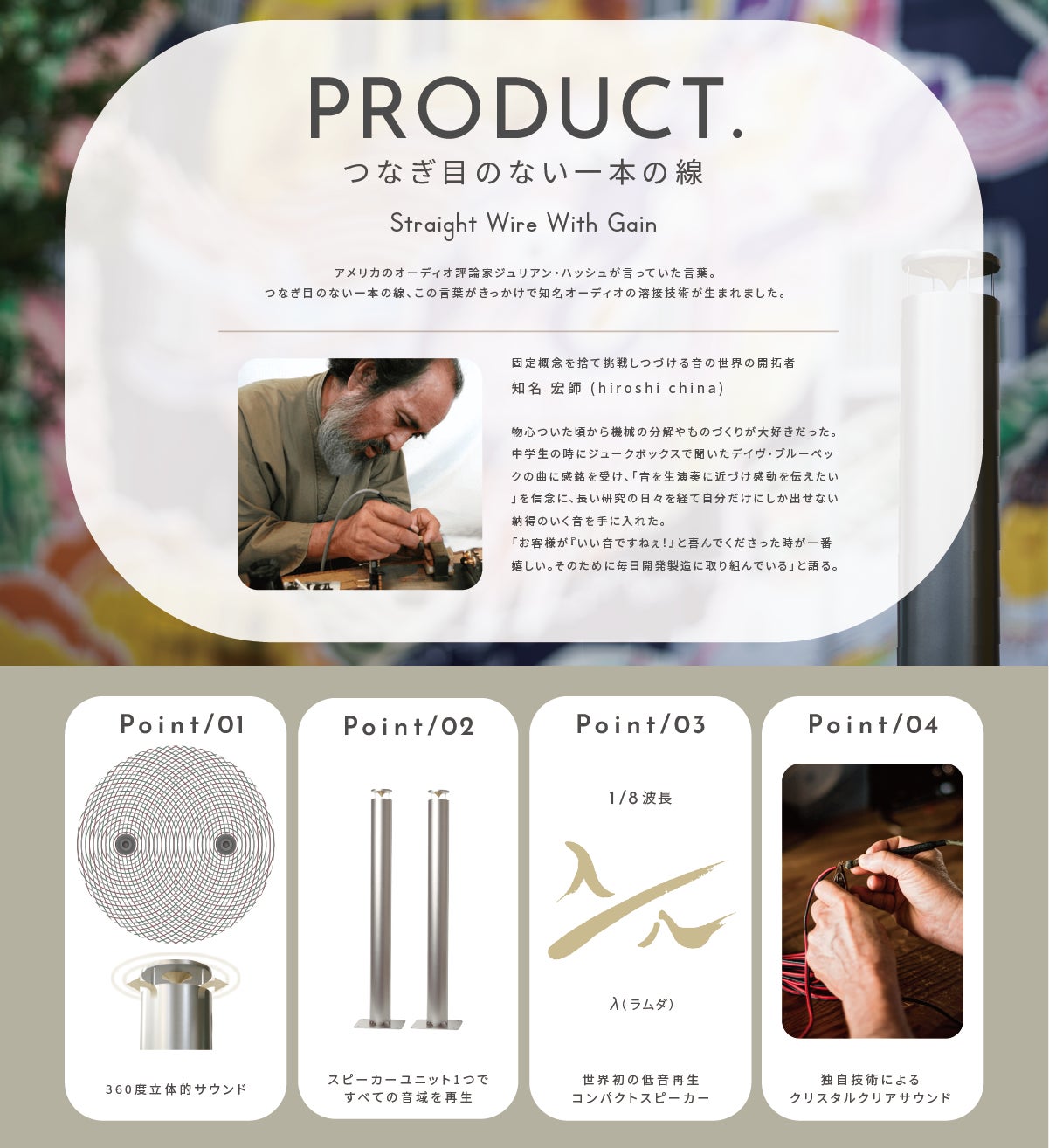 「音楽への愛」「お客様への愛」「家族への愛」…創業当時から今日に至るまで、知名オーディオは「愛」に溢れ、支えられ、育てられたブランドです。ブランドロゴのリニューアルに合わせ公開した新ブランドサイトでは、ブランドメッセージ、ストーリー、製品の魅力・特徴、創業者の動画などを通じて、知名オーディオというブランドの温かみを感じていただけるものに仕上げました。