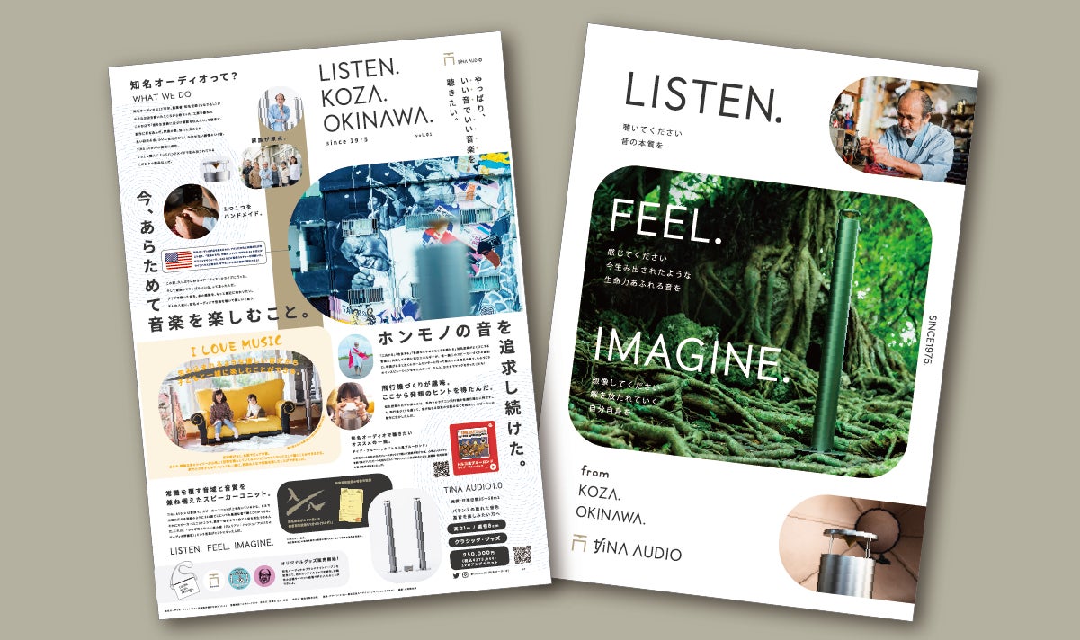 また、音楽を聴きながら家でリラックスして読んでいただけるよう、ブランドサイトのコンテンツをベースに、知名オーディオらしい遊び心溢れたデザインのオリジナルリーフレットも作成。知名オーディオの店舗や設置店等で無料配布しています。