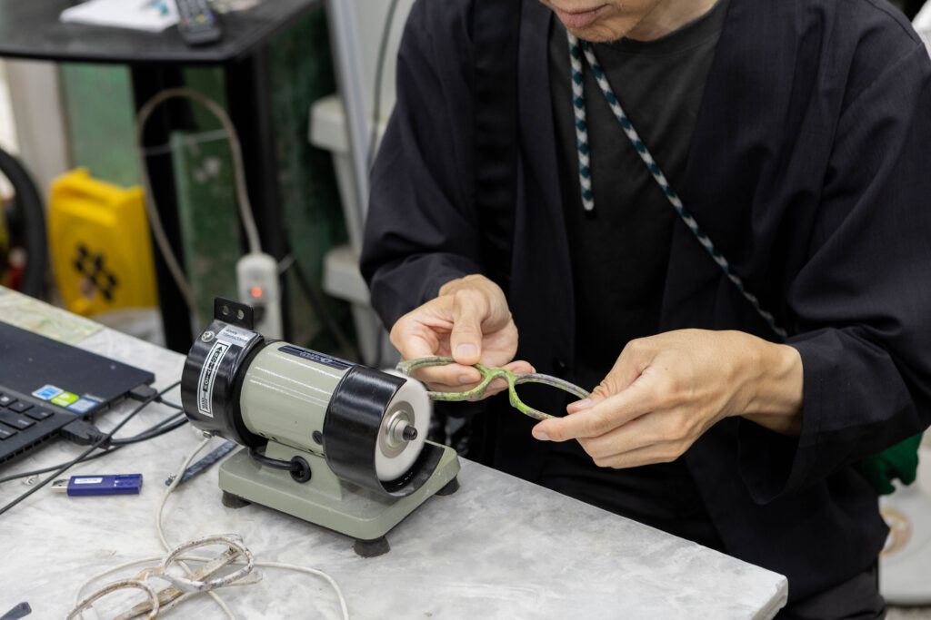 工程はわずか3ステップ。選んだ廃プラスチックに熱を入れながらプレスし、でき上がりをイメージしながらねじり、それをフレームの型に入れて形を整えます。そして、レンズ部分をくり抜いて、その素材を使ってメガネのテンプル(つる)の部分をつくっていき、サングラス用のレンズを組み込んで、やすりで整えたらできあがりです。その間、ものの20分ほど!